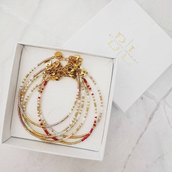 Dit armbandje was voorheen al verkrijgbaar in het zwart, nu is het tijd voor wat zomerse kleurtjes! Een heel delicaat armbandje dat gemaakt is van piepkleine kraaltjes, we loveeee it😍 Ook verkrijgbaar in het fuchsia, lila, pastelblauw, pasteloranje, vintage roze met goud of zilverkleurige kraaltjes.