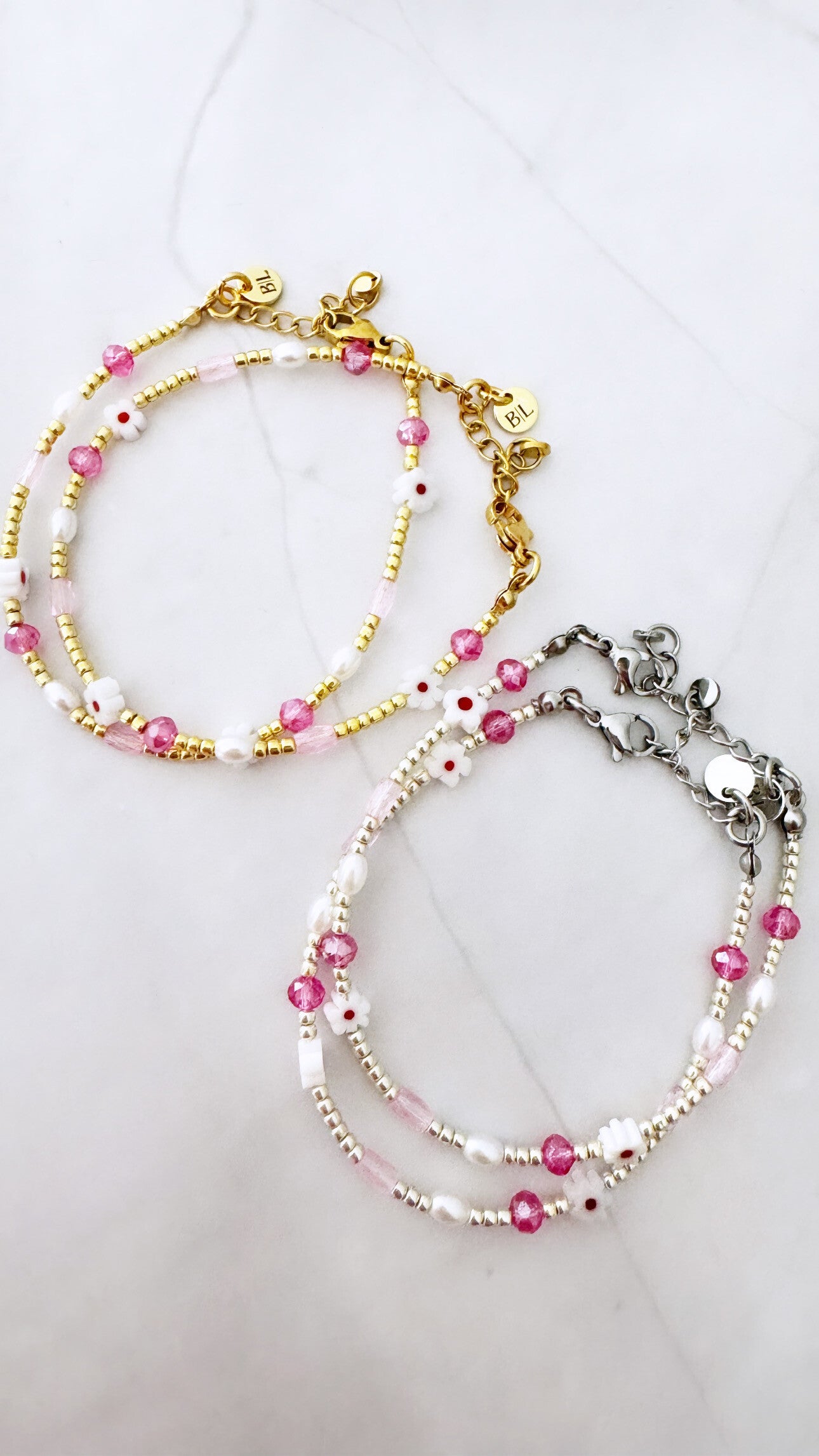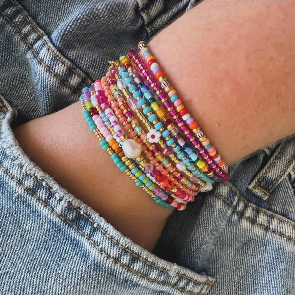 Het pink flower armbandje is in het zilver en goud verkrijgbaar. Superleuk om te mixen & matchen met andere armbandjes uit de By Linnn Jewelry collectie.