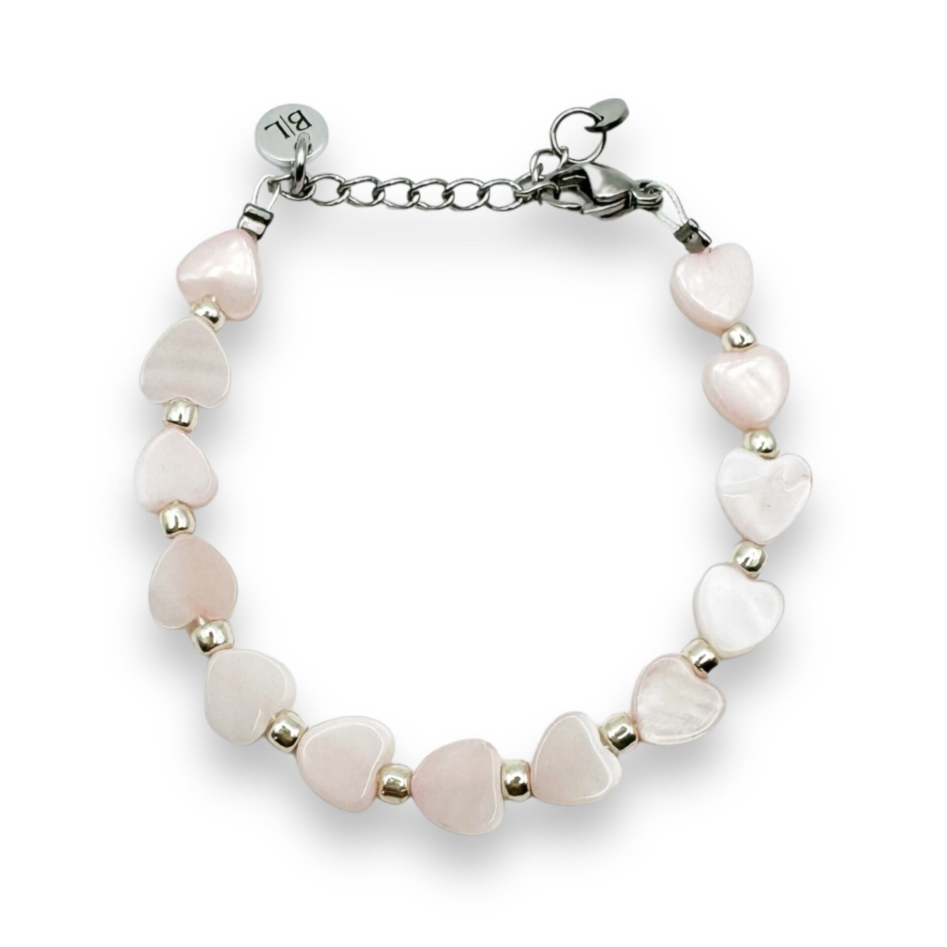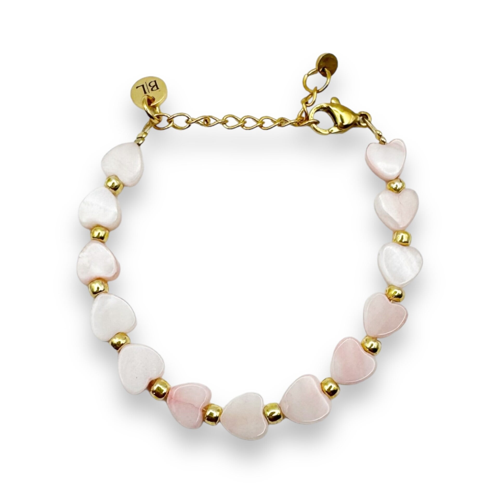 Dit armbandje is gemaakt voor de allerliefste meisjes onder ons. De mooie, zachtroze hartjes zijn gemaakt van schelpkraaltjes en laten elk meisje stralen.