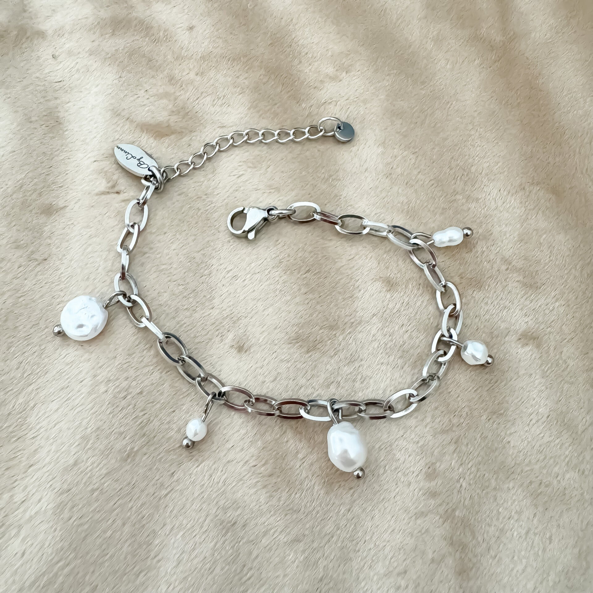 Dit mooie parelarmbandje is geheel gemaakt van stainles steel. Verstelbaar in maat van 14 t/m 19 cm.